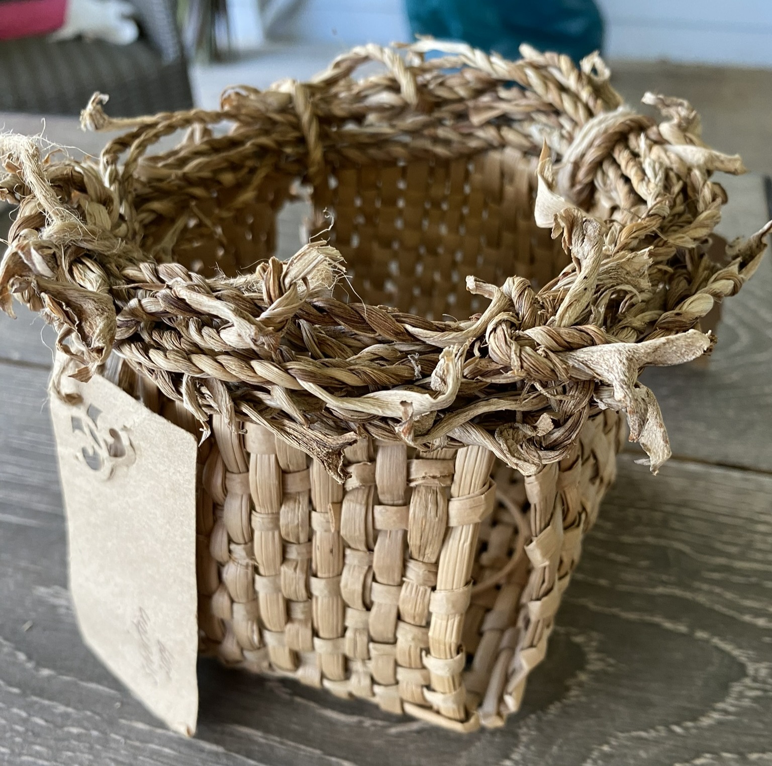I specialise in weaving functional baskets and small vessels, incorporating a variety of added resources as embellishment – cotton, fabric, leather and beads.